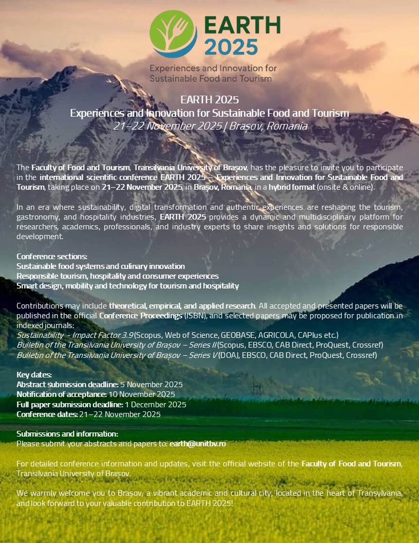 - All accepted and presented papers at EARTH 2025 – Experiences and Innovation for Sustainable Food and Tourism will be eligible for inclusion in the official Conference Proceedings, published by Transilvania University Press of Brașov, with ISBN.