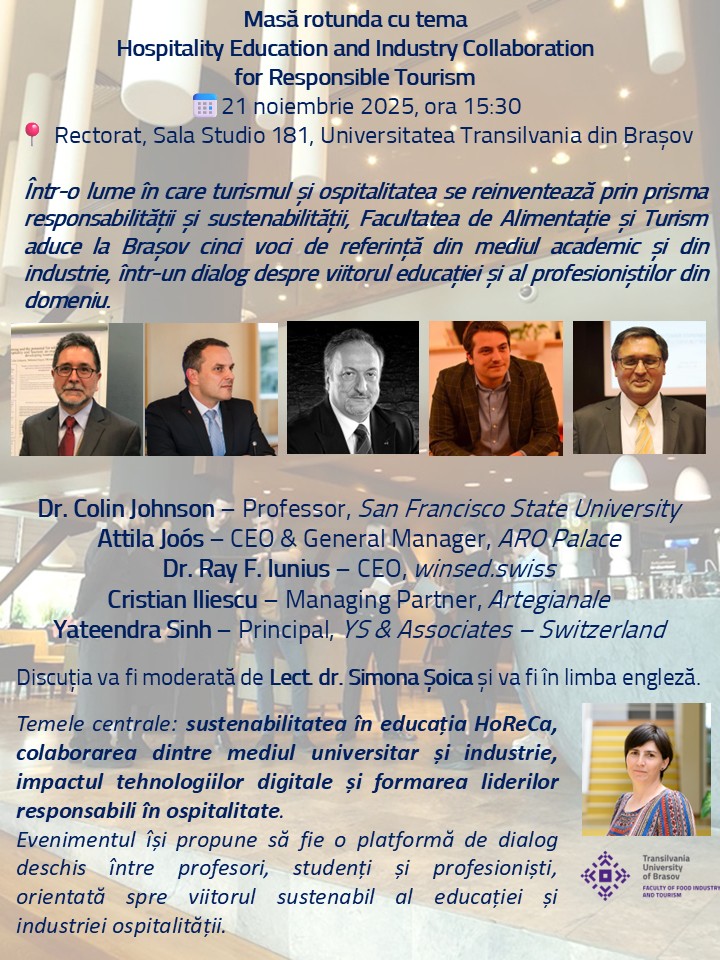 Facultatea de Alimentație și Turism are plăcerea de a vă invita să participați la masa rotundă cu tema „Hospitality Education and Industry Collaboration for Responsible Tourism”, un eveniment ce reunește specialiști din mediul academic și din industrie pentru a discuta despre perspectivele educației și ale ospitalității responsabile.